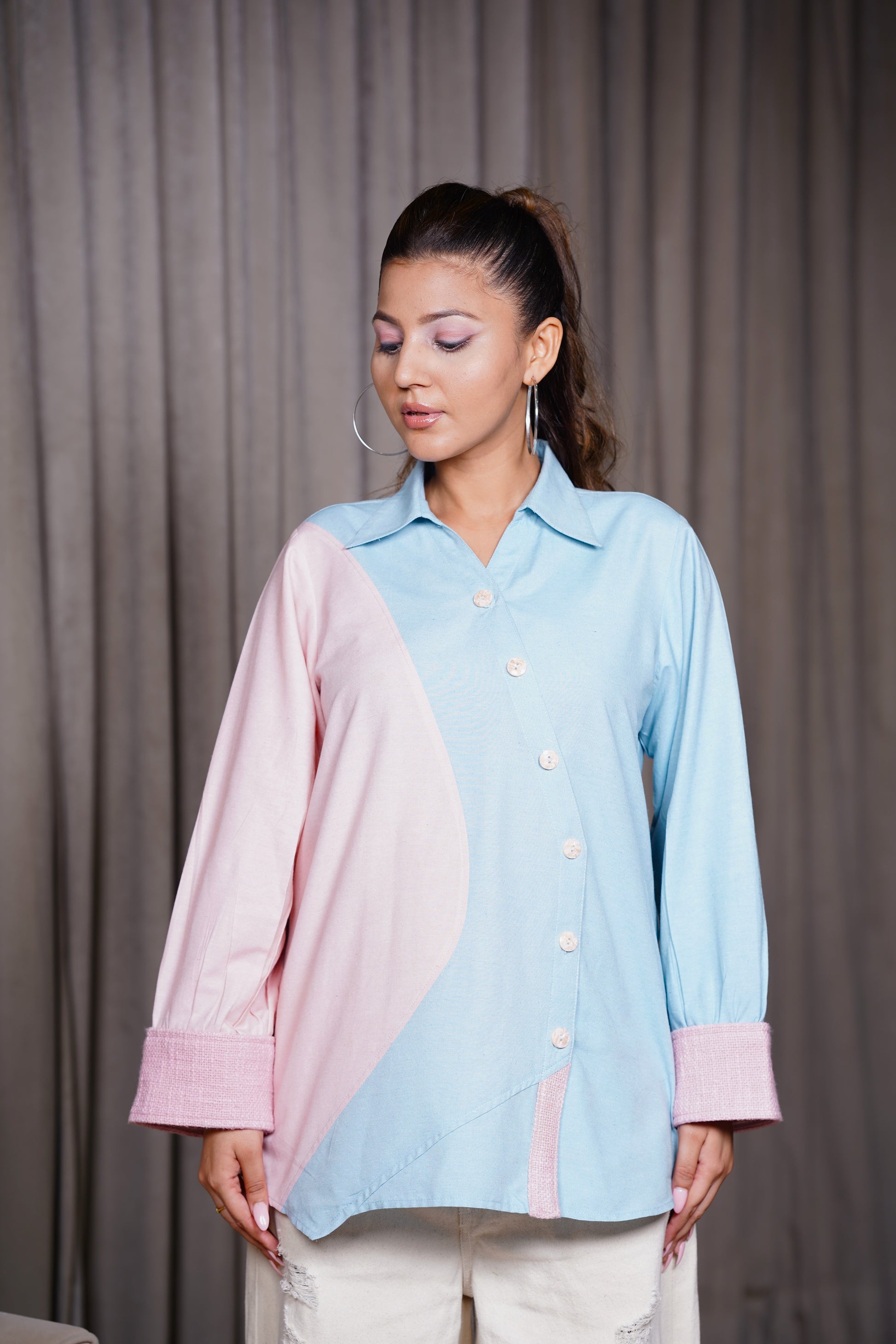The Blush Sky Shirt brings a romantic calm to modern dressing — pastel blue and blush pink flow seamlessly in a curved silhouette with soft cuff detail. A poetic piece from our Celesta: Stitch Two drop.