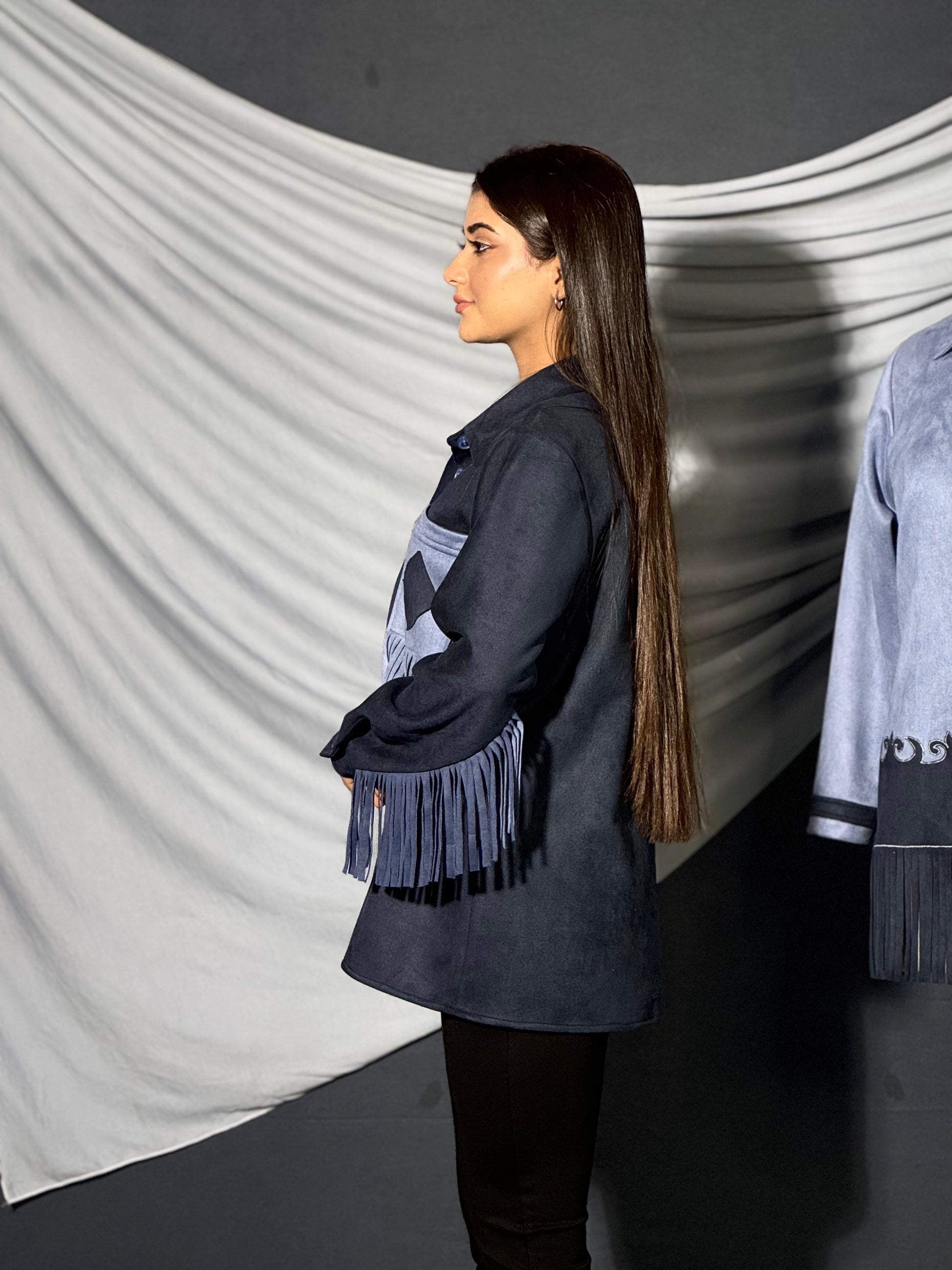 Where movement meets mystique. Saddle Fringe is crafted in plush suede with a deep navy base and powder-blue accents. Tonal fringes trace the sleeve and placket, adding fluid motion and a modern, western-luxe attitude. A contrast patch pocket and sculpted buttons complete the piece with quiet drama—made for winter evenings, gallery soirees, and everything after dark.