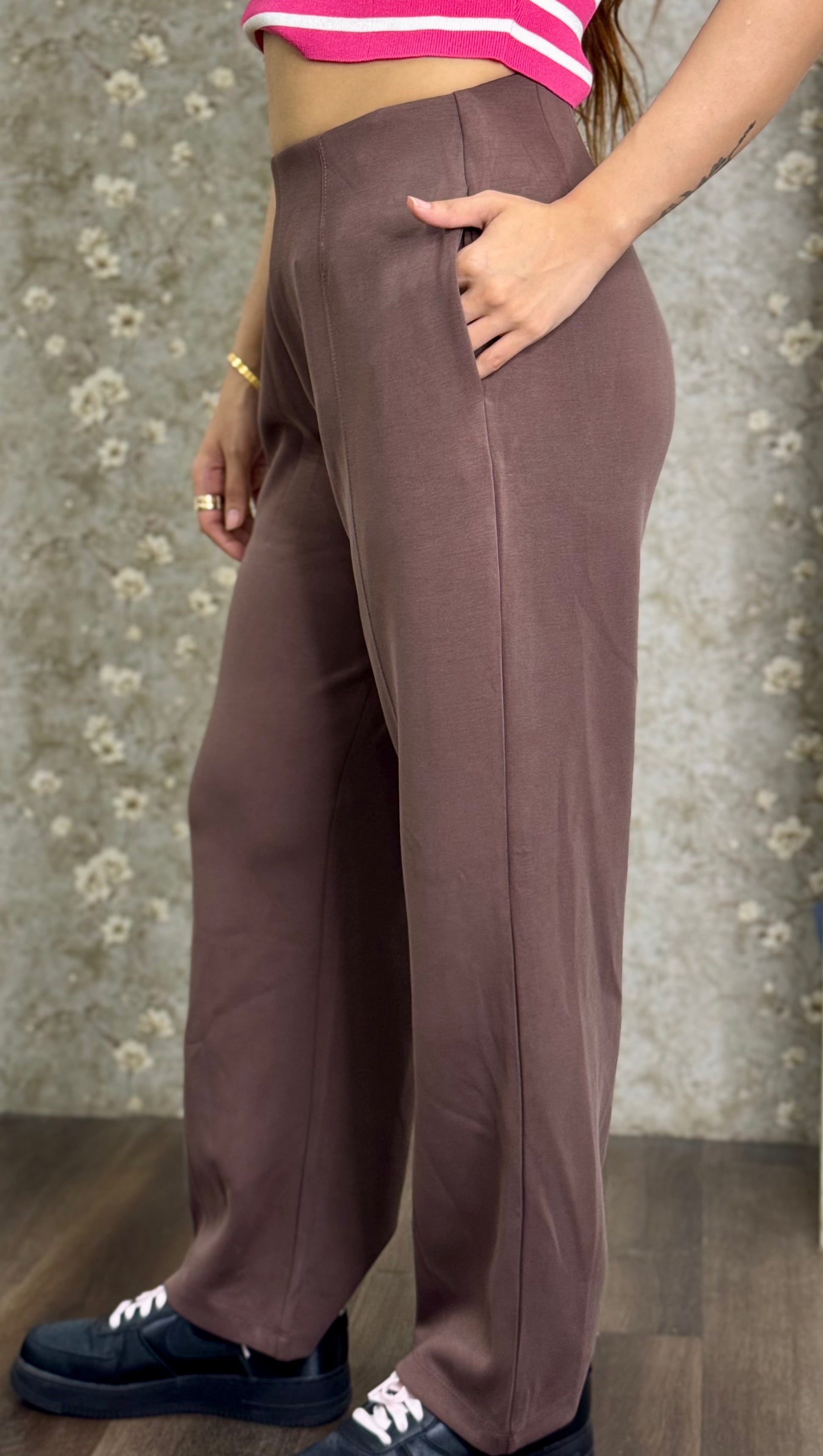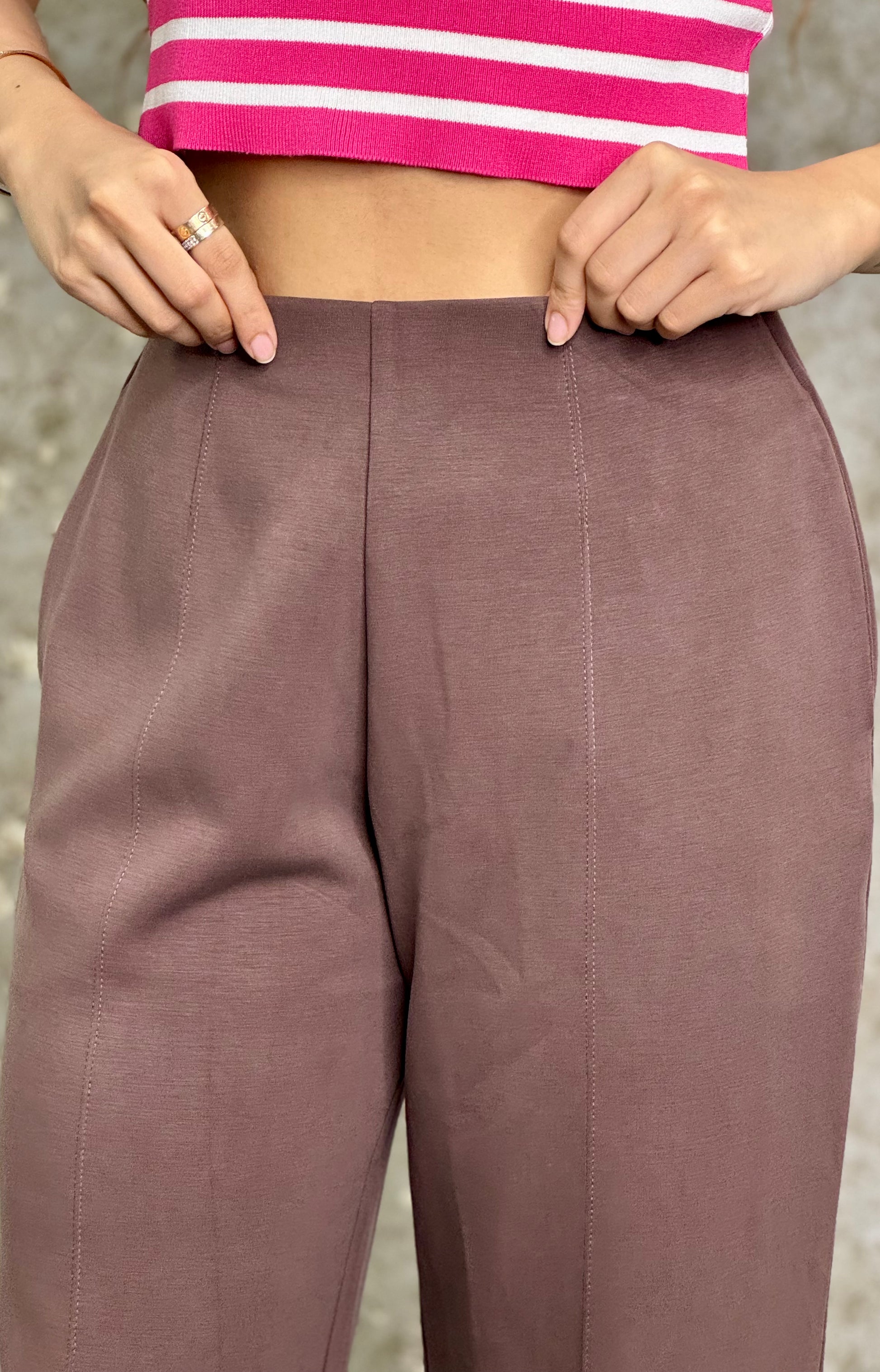 The Mocha Glide Pants are crafted for effortless elegance — relaxed, stretchable, and subtly tailored. The imported Korean modal spandex fabric ensures unmatched comfort while maintaining a polished drape. Perfect for work, lounge, or travel edits.