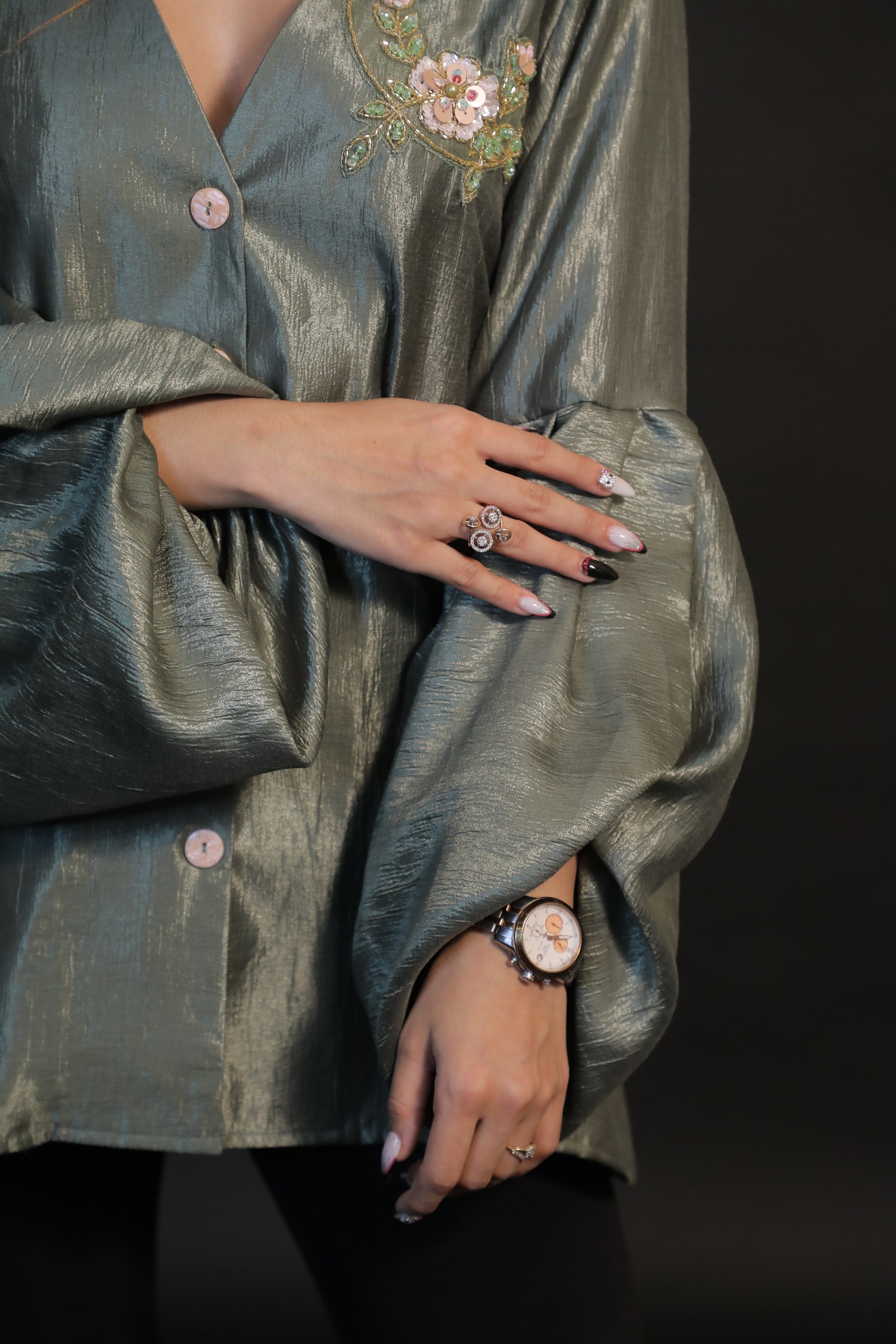 The Olive Grace Embroidered Shirt blends modern sophistication with artisanal charm. Tailored in a luxurious crush satin fabric in a muted olive tone, it features voluminous balloon sleeves and a flattering V-neckline for an effortlessly chic silhouette. A delicately hand-embroidered floral motif in soft pastels, highlighted with sequins, beads, and pearls, adds a hint of shimmer that makes this shirt ideal for the festive season.