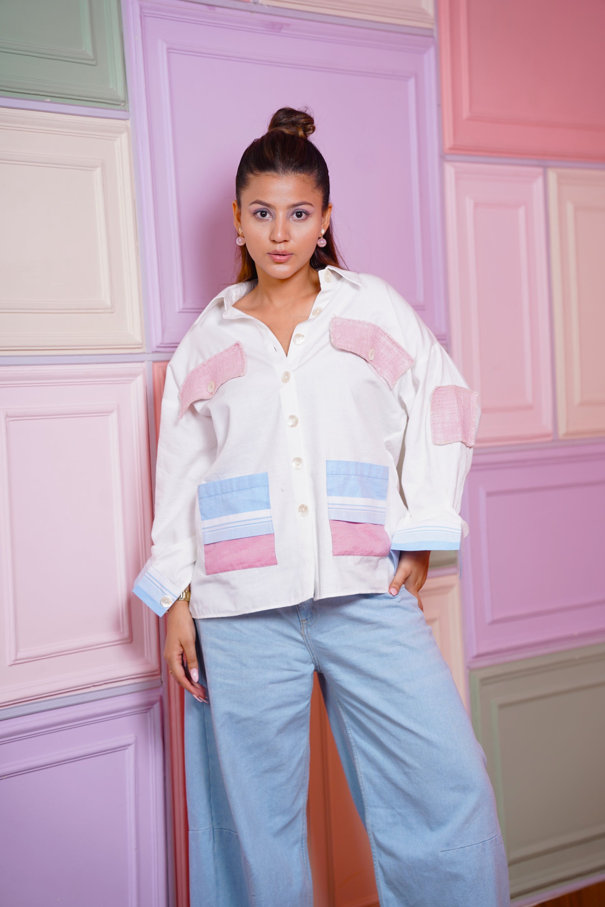 The Patch Play Shirt brings joyful geometry to minimal silhouettes. Set against an ivory canvas, pastel patch pockets in blush and blue create a collage of texture and tone. A boxy fit and raw detailing make it an everyday statement from our Celesta: Stitch Two edit.