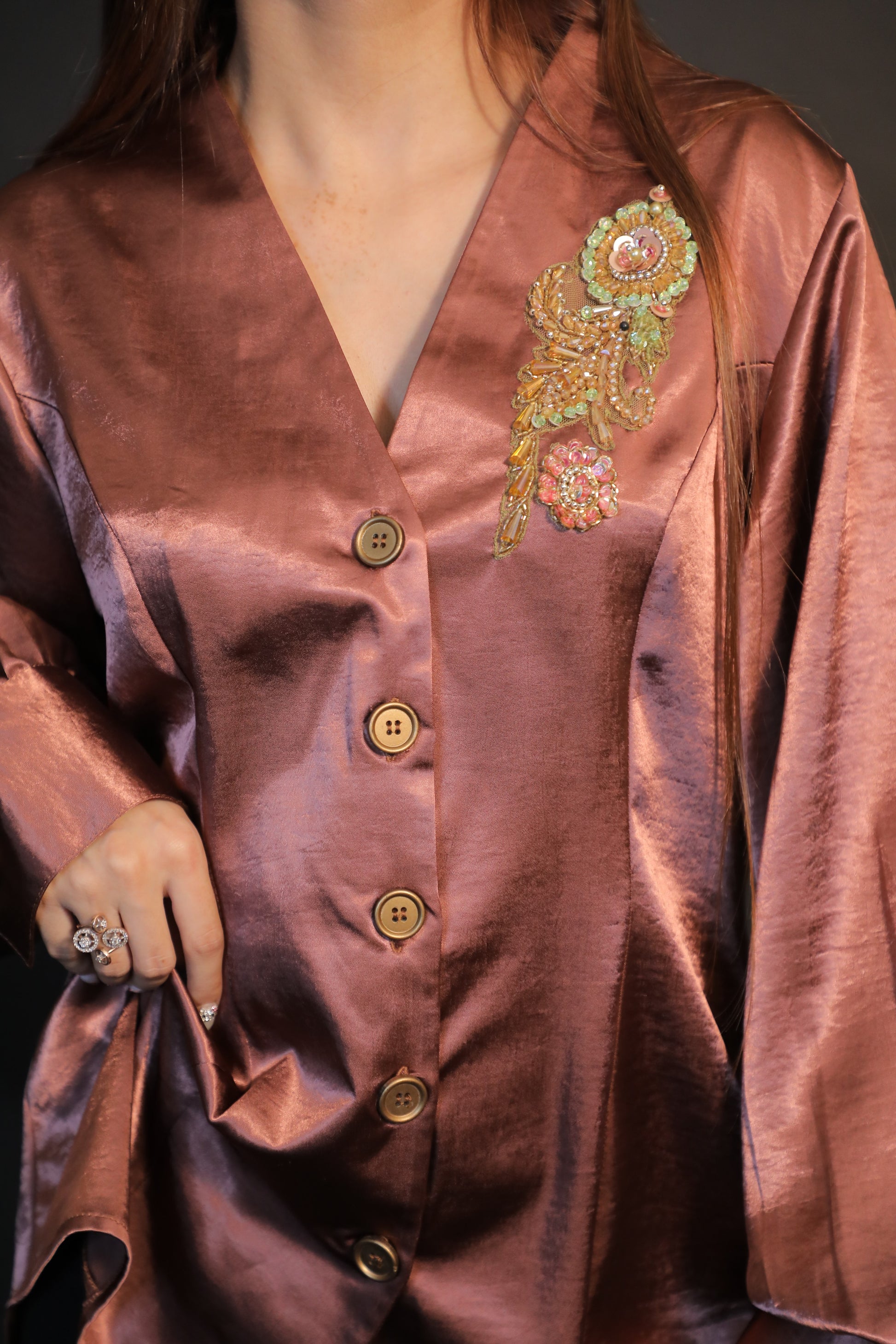 The Roselle Bronze Embroidered Shirt is an ode to refined festive elegance. Tailored from lustrous bronze satin, this shirt features a deep V-neckline and statement cuffs that exude sophistication. A delicately hand-embroidered floral motif with sequins, beads, and zari threads adorns the front, adding a touch of regal artistry to its minimal silhouette.