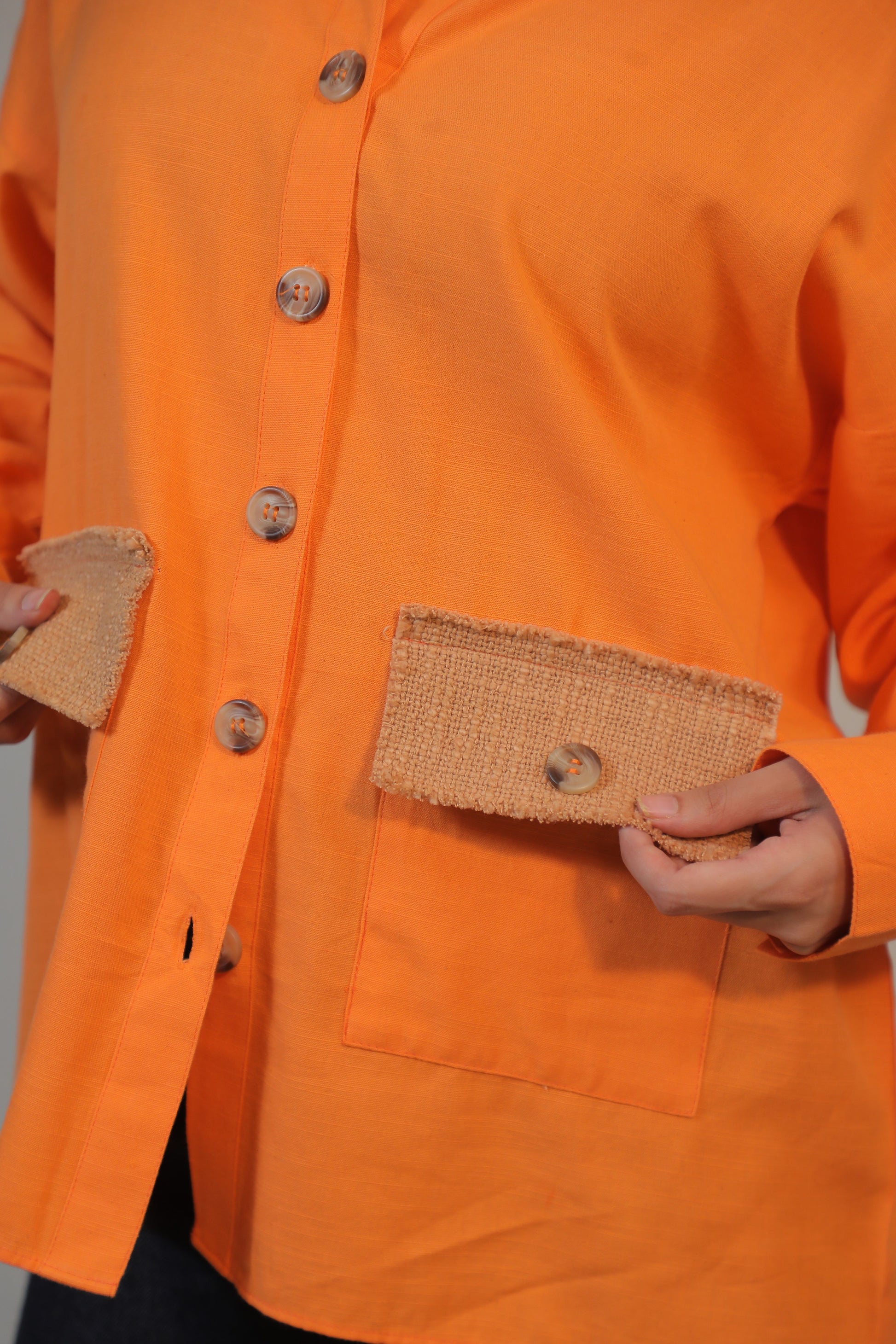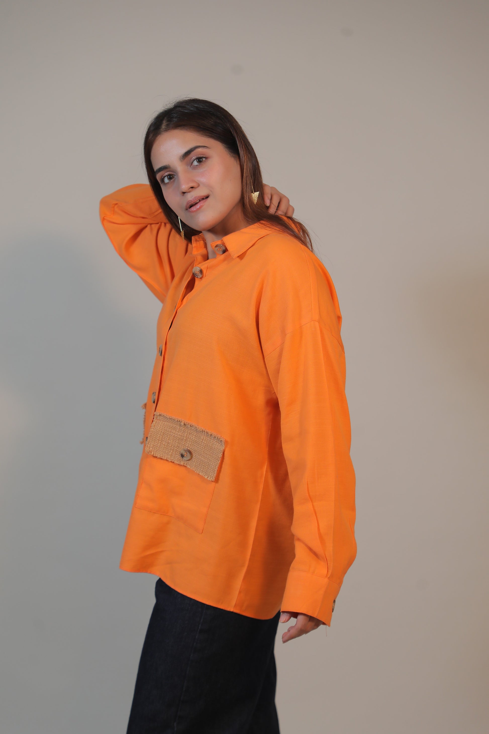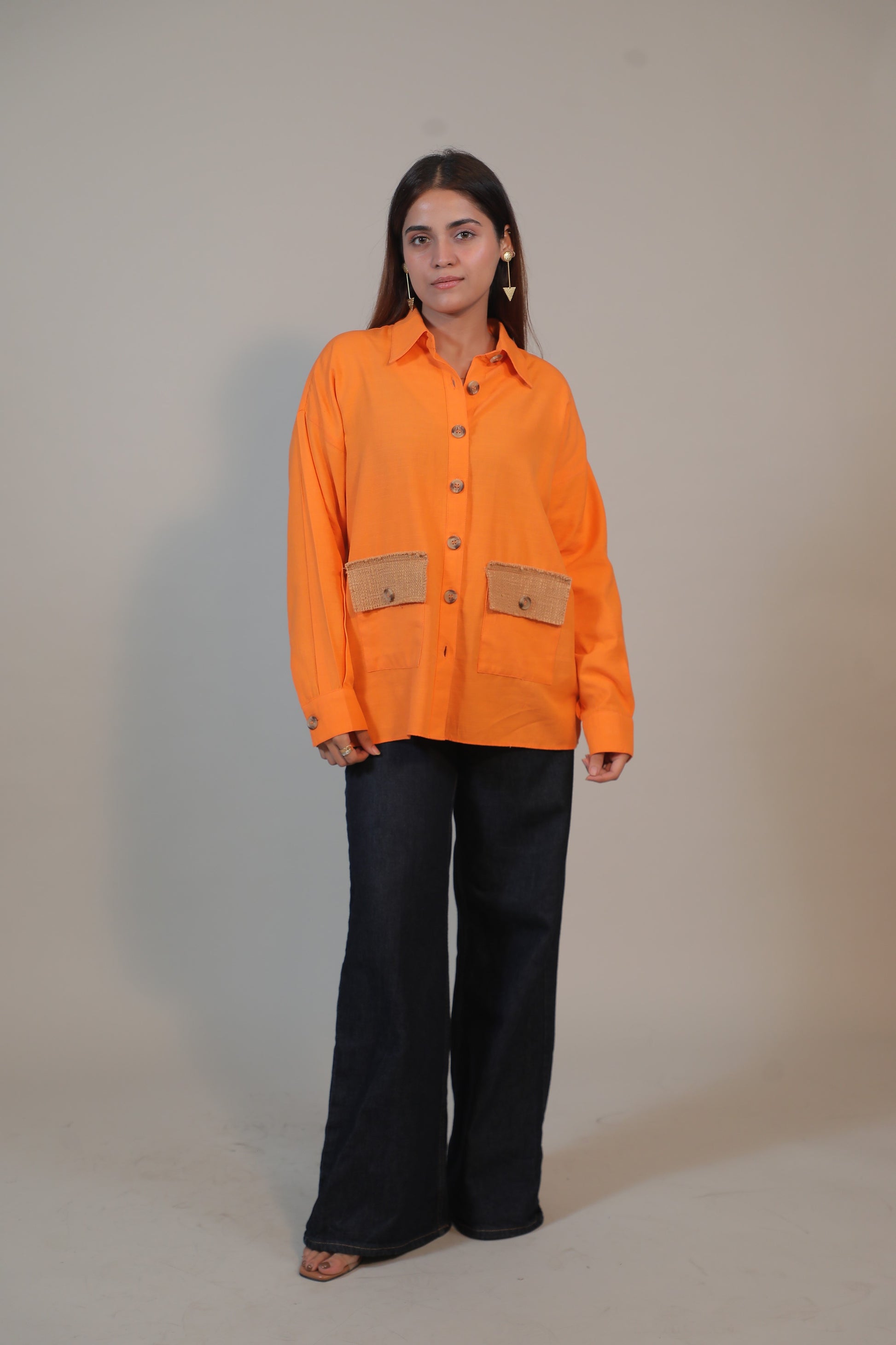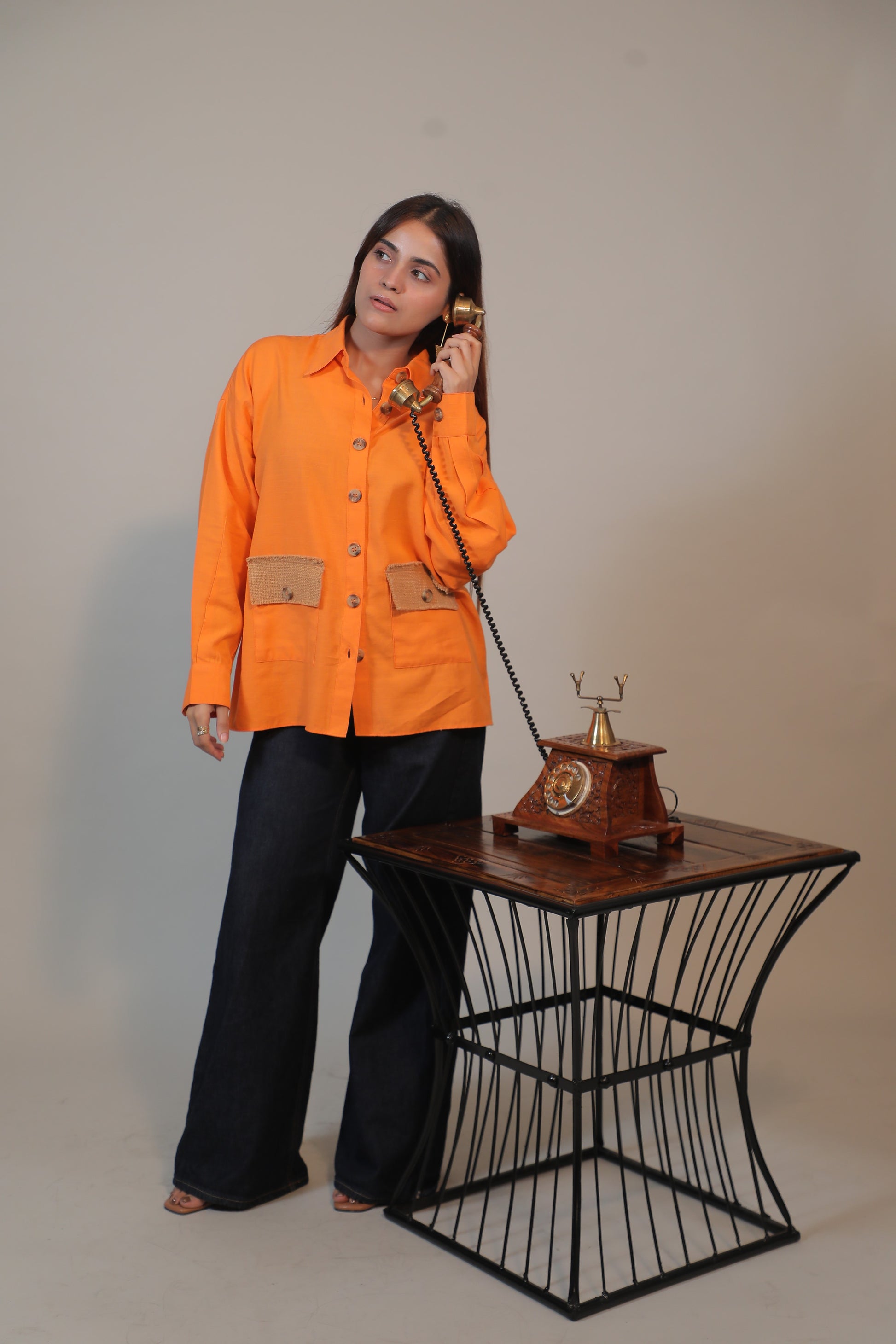 Infused with earthy charm, the Rustic Glow Shirt from Celesta: Stitch Three brings together vibrance and raw elegance. Designed in a striking orange hue with textured jute-inspired pockets, it reflects a rustic yet modern vibe — perfect for those who love statement details with timeless comfort. A versatile piece that pairs seamlessly with denims, trousers, or festive bottoms.