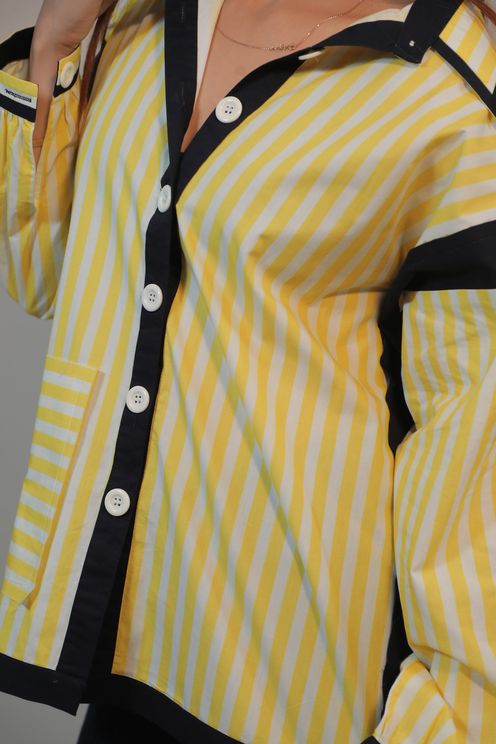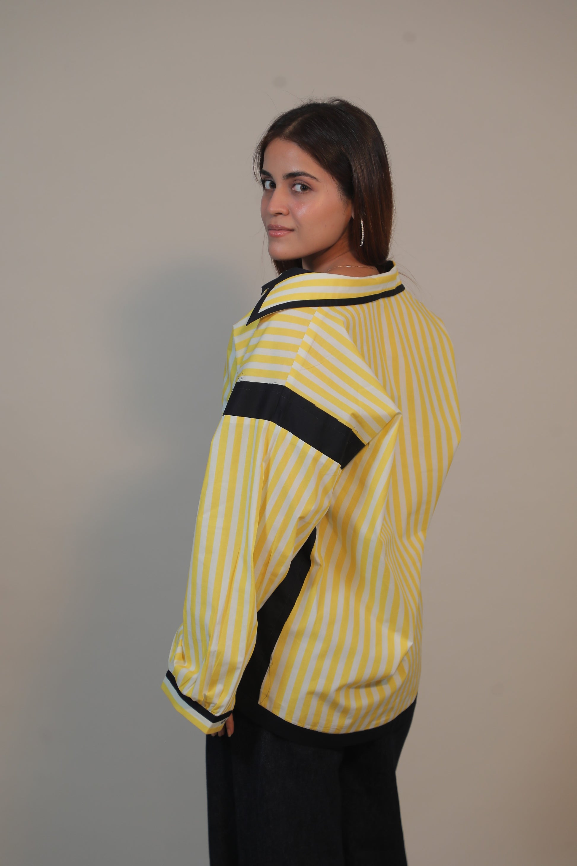 Radiant and confident, the Sunlit Stride Shirt from Celesta: Stitch Three channels the joy of golden daylight with a bold, contemporary edge. Featuring refreshing yellow-and-white stripes offset by deep black contrast panels, it’s a shirt that celebrates movement, vibrance, and effortless style. Designed for both festive gatherings and chic everyday wear, it’s a versatile piece that shines wherever you go.